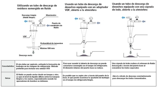 El lodo descargado pierde rápidamente su fuerza de rotación, se recoge en la cápsula de lodo y se recoge hasta la descarga, ya sea manualmente o por medio de una válvula solenoide. Cualquier lodo ultrafino que no pueda generar suficiente fuerza centrífuga y descender por la pared interna del separador se descarga junto con el líquido de limpieza del puerto superior. Durante este proceso, un área de baja presión está presente en el centro del separador.